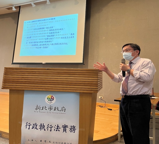 本府本年度第1次行政法專題講習,於5月16日上午9時至12時,在本府行政大樓307會議室舉辦完畢,本次講習很榮幸邀請到法務部行政執行署新北分署黃有文主任行政執行官擔任講座,講授「行政執行法實務」課程,參訓同仁共計為90名。本次課程主要以公法上金錢給付義務之執行為核心,除了解說行政執行流程、相關法令及實務運作,並透過本府各機關及區公所移送執行案例常見錯誤態樣,提點同仁辦理行政執行案件應注意事項,讓本府參訓同仁能對行政執行實務有更深入的瞭解,強化同仁對於行政執行法之運用。